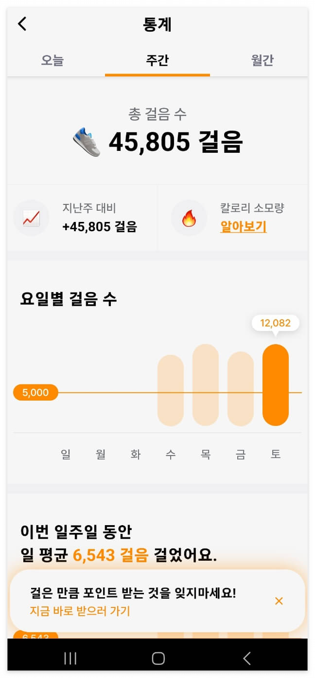 - 걸은 만큼 걸음수가 올라갑니다! 50걸음마다 신발 버튼을 눌러주면 1포인트를 받습니다.