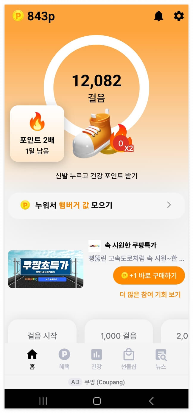 - 5000보를 걸으면 100포인트를 받을 수있지만 포인트를 2배를 줘서 200포인트를 받을수 있답니다, 또한, 쇼핑적립, 설문조사적립, 미션적립을 통해 추가 포인트도 받을수 있답니다,